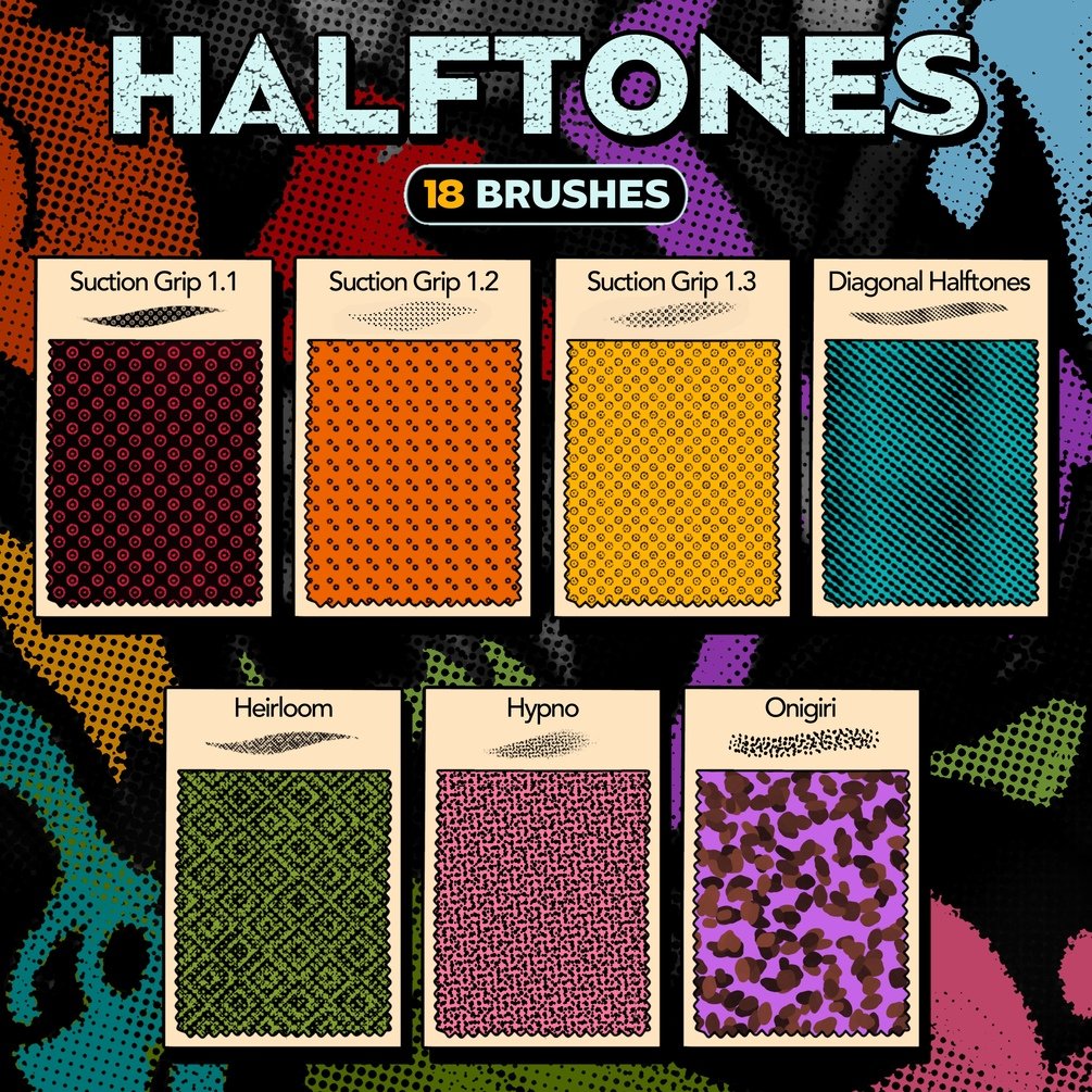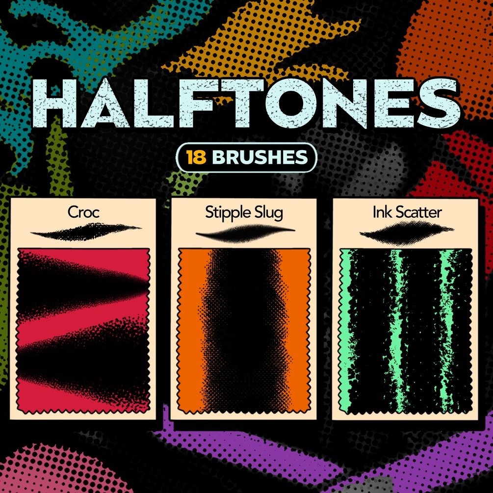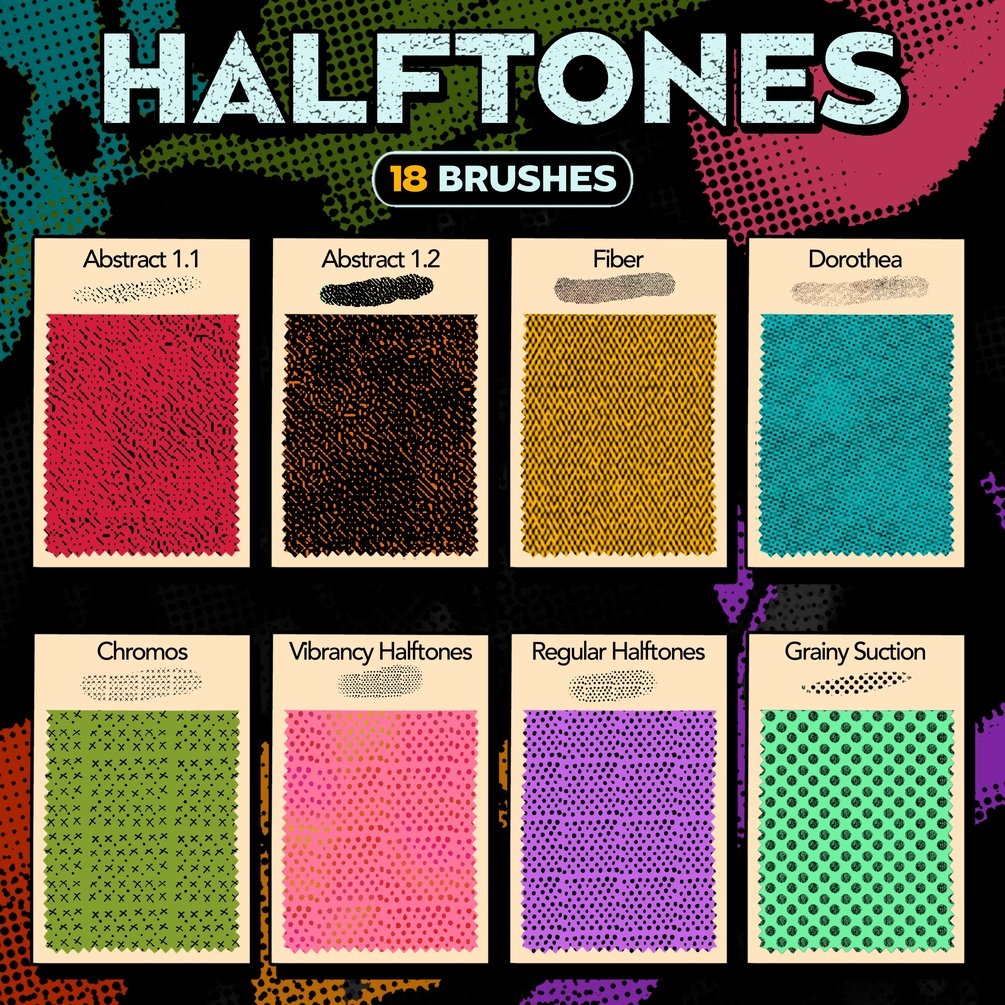 • 18 Halftone Brushes – Add retro, print-inspired flair with dots, lines, and tonal gradients