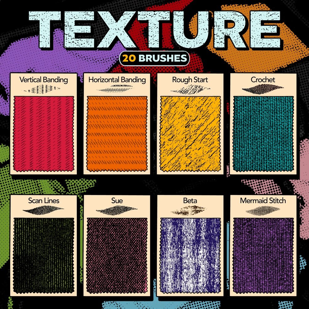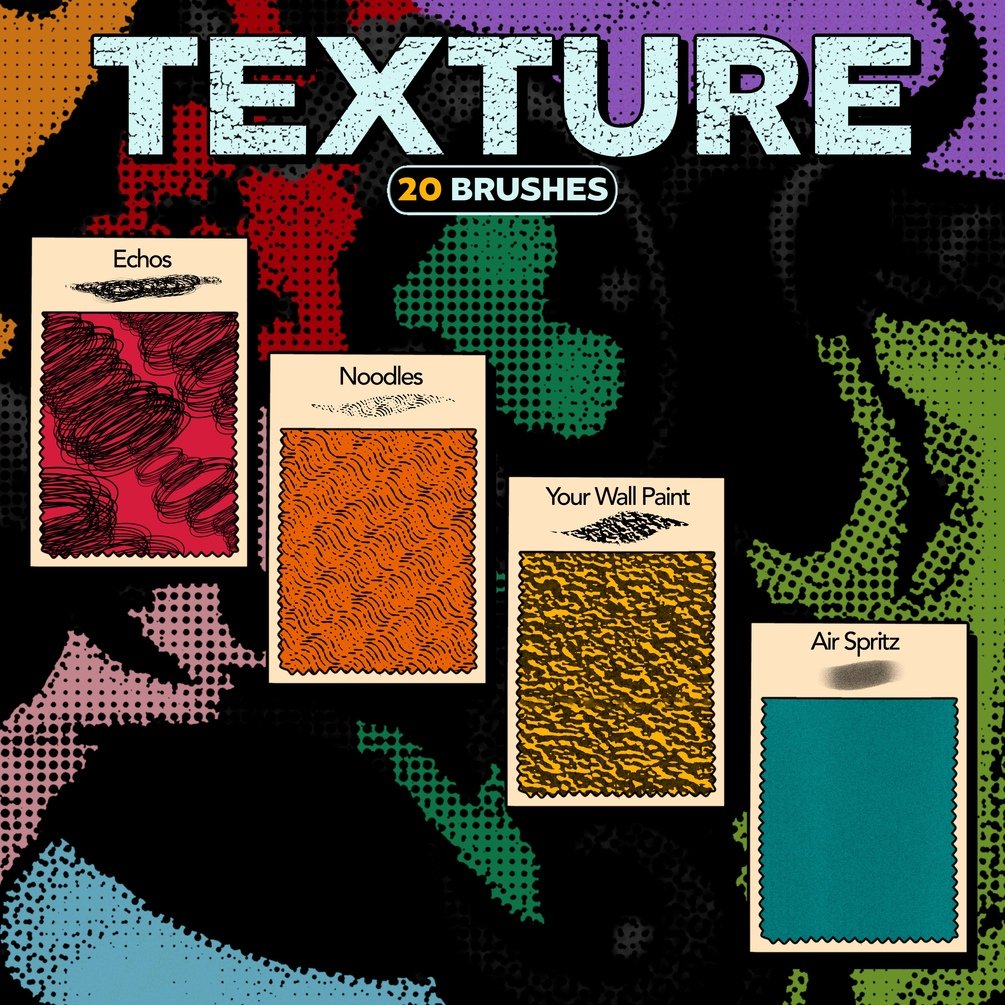 ✧ What’s Inside: (20) Texture Brushes, (18) Halftone Brushes, (13) Lineart & Render Brushes, (5) Marker Brushes, A video user guide with step-by-step tutorials, Tips on combining brush effects (like 3D mesh textures and distressed overlays).